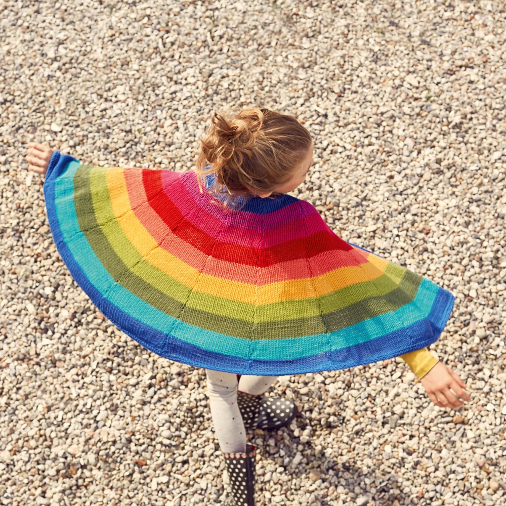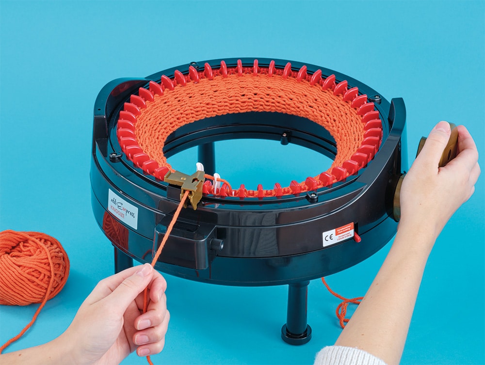 It produces stockinette stitch, which is a smooth, v-patterned fabric, when knitting in the round, making tubes up to about 35cm / 13.8" in diameter. These tubes are ideal for hats, cowls, or seamless sleeves. You can also create flat panels up to roughly 45cm / 17.7" wide, great for scarves, blanket strips, sweater bodies, or home textiles like cushions and throws. Thread the yarn, flip the switch for round or flat mode, and turn the crank. It's straightforward even if you've never used a knitting machine before.
