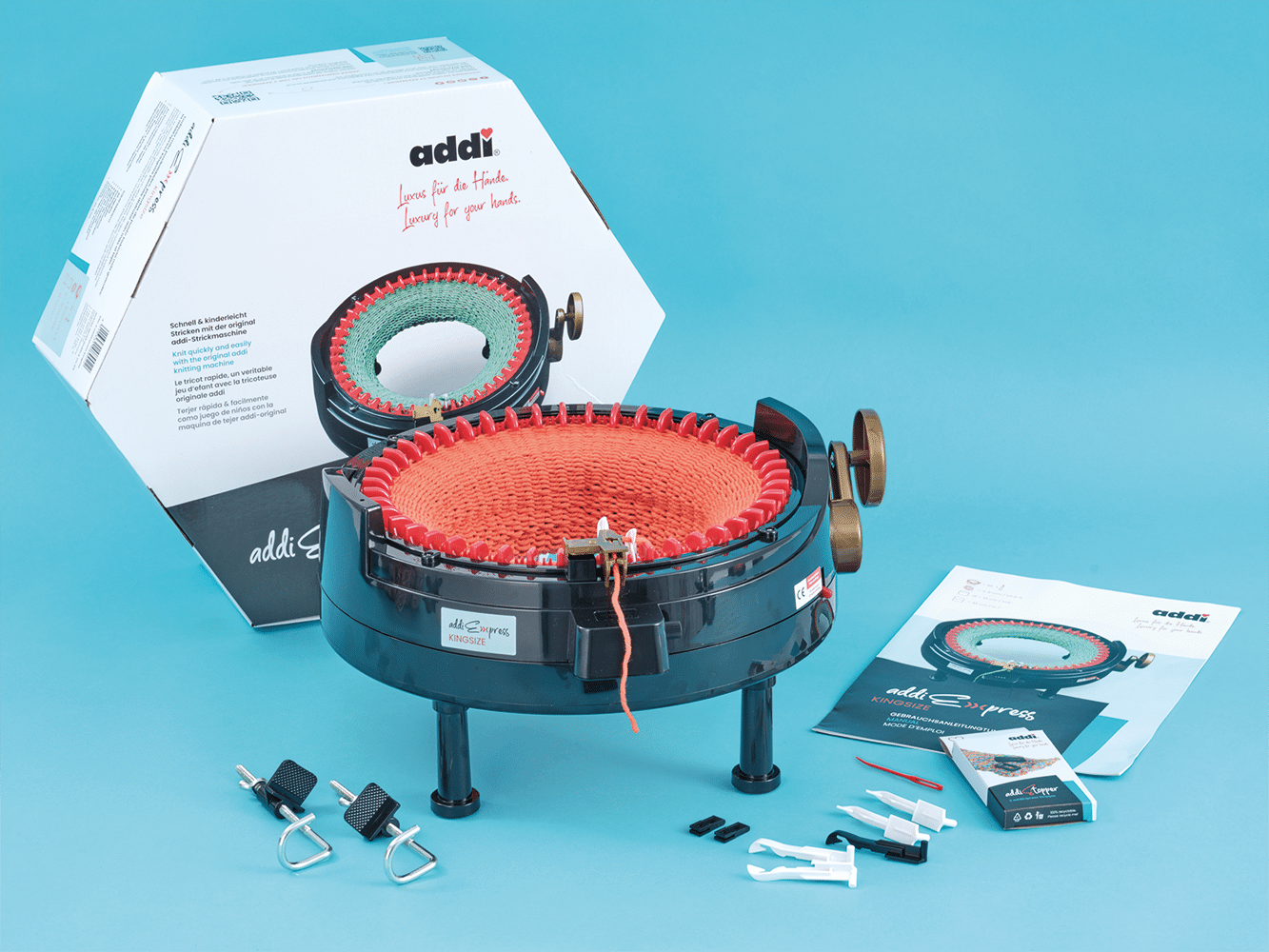It works with a range of yarns from needle sizes US 6–11 (4–8mm), so you can use worsted-weight through chunky-weight yarns, depending on tension and the look you want. Built solidly in Germany, it includes a built-in row counter, needle holder, threading tool, replacement needles, clamps for stability, and basic accessories to get started.